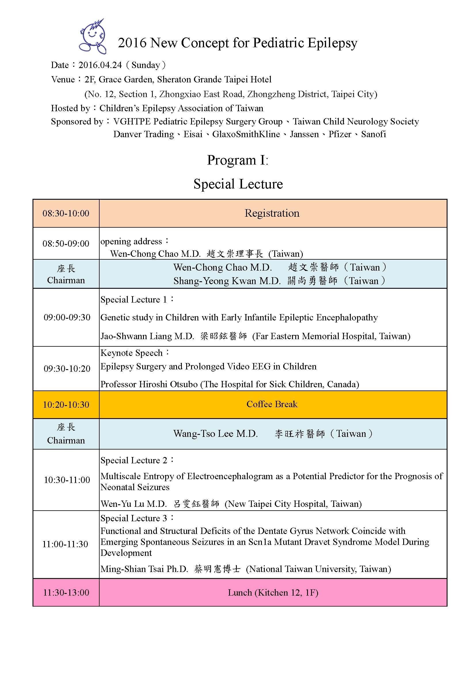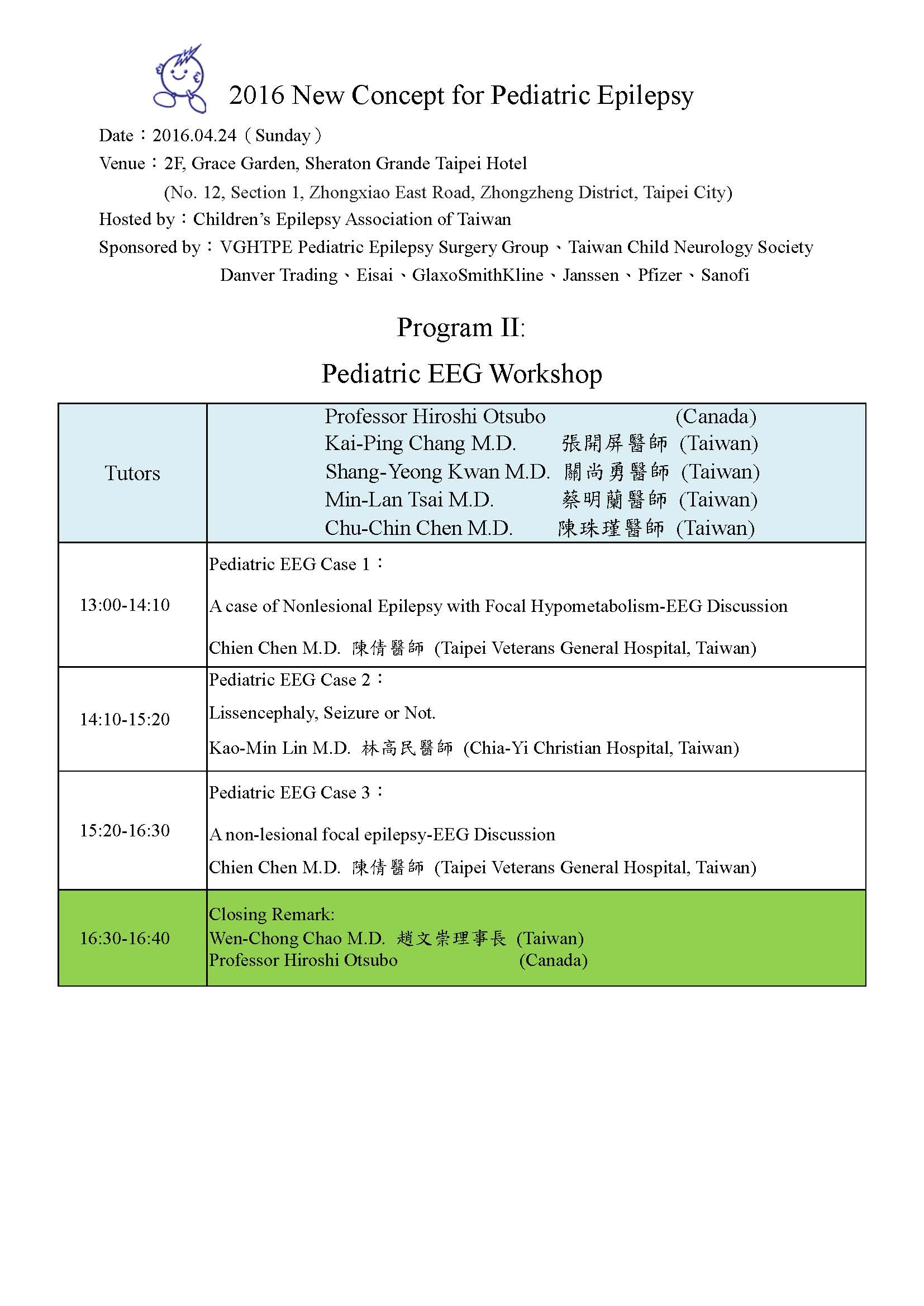 台灣兒童伊比力斯協會年度的學術會謹訂於2016年4月24日(星期日)假喜來登大飯店-- 瑞穗園舉行,這次的會議主題為『2016 New Concept for Pediatric Epilepsy』,特別邀請國際知名的加拿大兒童癲癇專家Professor Hiroshi Otsubo來台,Professor Otsubo在『神經生理學』、『神經影像分析』、『腦波分析』等領域有卓越的研究成果,希望藉著這次會議將他最新的兒童癲癇臨床與學術研究成果分享給所有與會者,這次會議上午安排Special Lecture、下午安排Pediatric EEG Workshop。