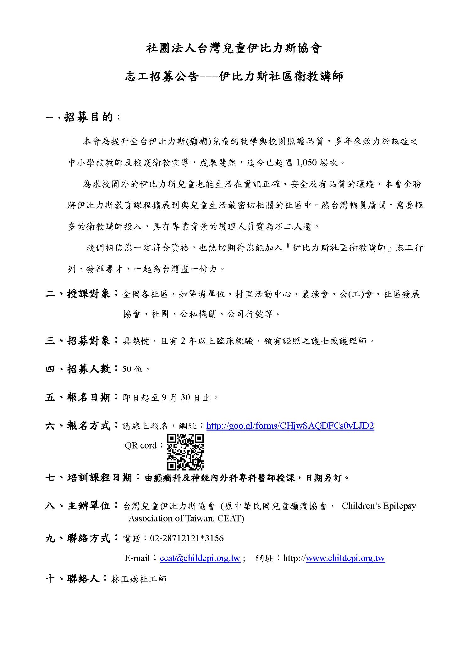 一、招募目的:本會為提升全台伊比力斯(癲癇)兒童的就學與校園照護品質,多年來致力於該症之中小學校教師及校護衛教宣導,成果斐然,迄今已超過1,050場次。
