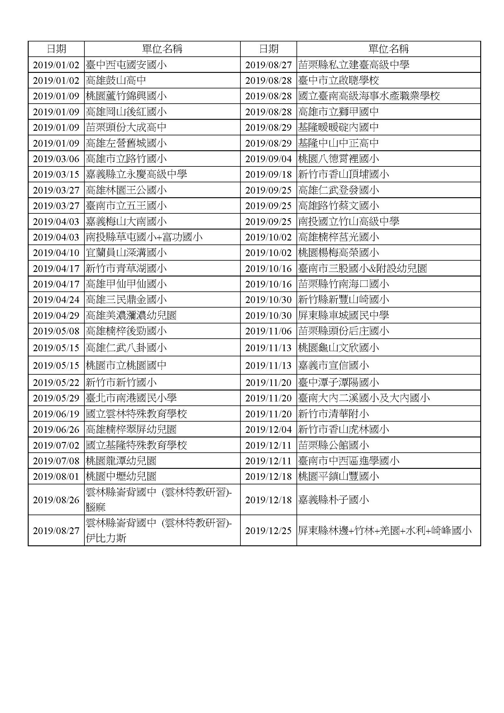2019 目前預定辦理場次表